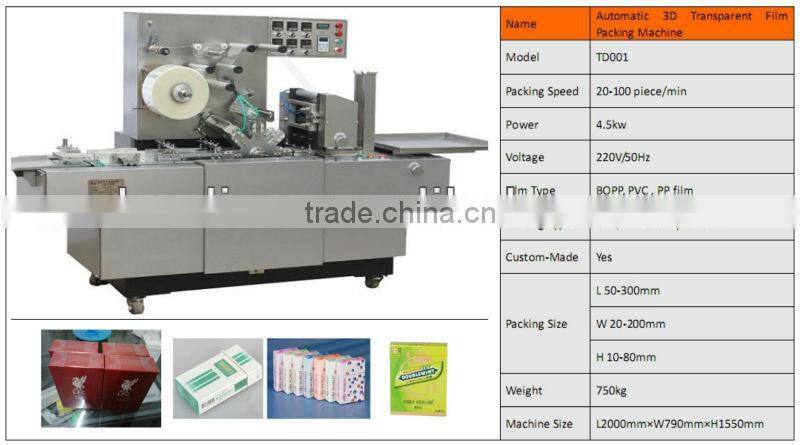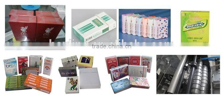 It is mainly used in medicine, food, health care products, cosmetics, audio-visual products, and other industries square exterior decoration items boxed packaging. Such as kit, gum, health products, tea, sugar, condoms, rubber, mosquito coils, cigarettes, tape, VCD (CD) CD, playing cards, transparent soap, square battery, floppy disks, etc. play a security, the role of moisture, and improve product quality, increase product added value. The machine can use in the production line, work with the carton packing machine.