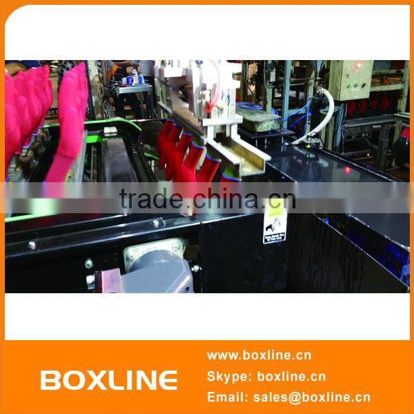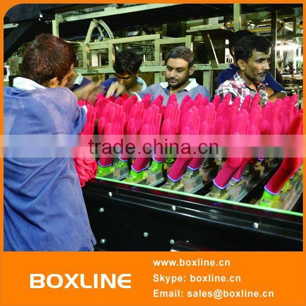People manually put the gloves mould on the automatic conveyor.