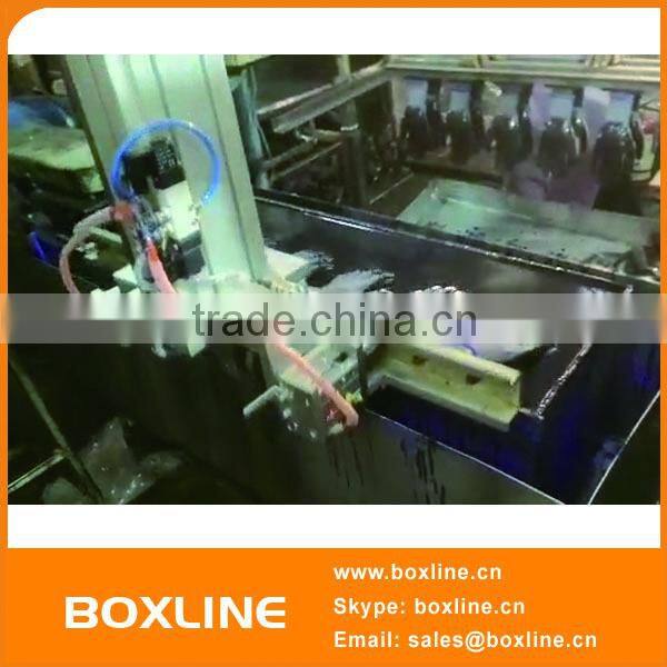 People manually put the working bar in upward position on the automatic conveyor----people manually put the gloves on the working bar----The working bar will gloves will go forward automatically----Robot arm pick bar from the conveyor---Moving to