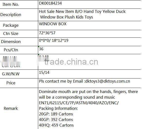 Name:Hot Sale New Item B/O Hand Toy Yellow Duck Window Box Plush Kids Toys
