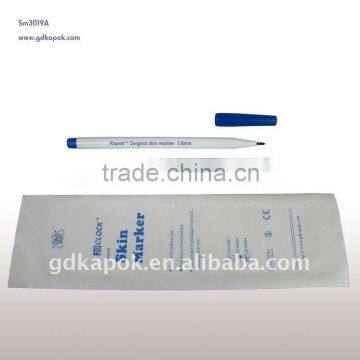Surgical skin makers Scrub resistant inks Singal tip Non-smearing, Available in sterile and non-sterile Specification: Coler: voilet, Length: 160mm, Diameter: 9mm, Tip: 1.0mm, Pen+ruler+pouch=1set, 50sets/box, Surgical skin makers Scrub resistant inks Non-smearing, Available in sterile and non-sterile KAPOK™ surgical skin markers are designed to allow the surgeon to conveniently demarcate selected sites, prior to or during surgical procedures with scrub-resistant, non-toxic, highly visible, gentian violet-colored solution. Eliminating the messiness and inconvenience of using cotton-tipped swabs dipped in marking dye, sterile ME-71™ Surgical Skin Markers produce ultra fine, fine, medium and broad lines, with high visibility on skin surfaces during surgical procedures. The special grooved barrel on the KAPOK™ also ensures secure grip while marking. The accompanying ruler in each pack, permits accurate measurement (marked metrically and in inches), and provides a straight line while having the flexibility to conform to all body contours. · KAPOK™ surgical skin markers can be used in a wide variety of surgical procedures: e.g., Fine/Regular Tip for use in general surgery; the Ultra Fine Tip for use in plastic surgery and the Broad/Utility Tip for orthopedic use. Each KAPOK™ Surgical Skin Marker is in a sterile (gamma radiated) package for easy fiber-free aseptic presentation. Additionally, the KAPOK™ is available in unsterile bulk packaging. Surgical skin marker, skin marker, surgical markers, surgical marker, single use surgical instruments, surgical pen, gentian violet marker, viscot medical, sterile skin markers, sterile skin marker, sterile surgical markers,
