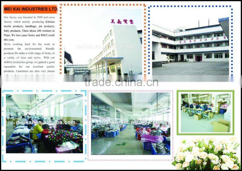 Since established in 1995,We are professional manufactory of kitchen texile with 20years. we're working hard for the work to promote the environmental friendly products,We make a wide range of items, in a variety of sizes and styles, Our factory is located in the DongGuan City Guangdong Province, With our skillful production group, we gained a good reputation for our excellent quality products. Customers are also very please with our fast-paced work, after-sale service and competitive price, we have UK big customers cooperate for more than 15years. We are trustworthy in our industry. Delivery on time, have a big quality inspector control the bulk production. Anywhere, we are friendly to all our business friend. You're welcome to visit our factory at any time.