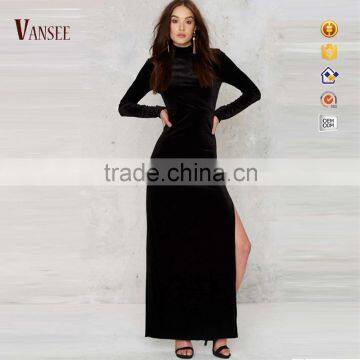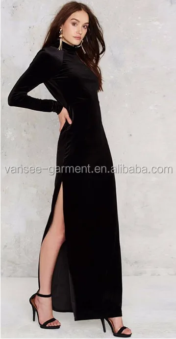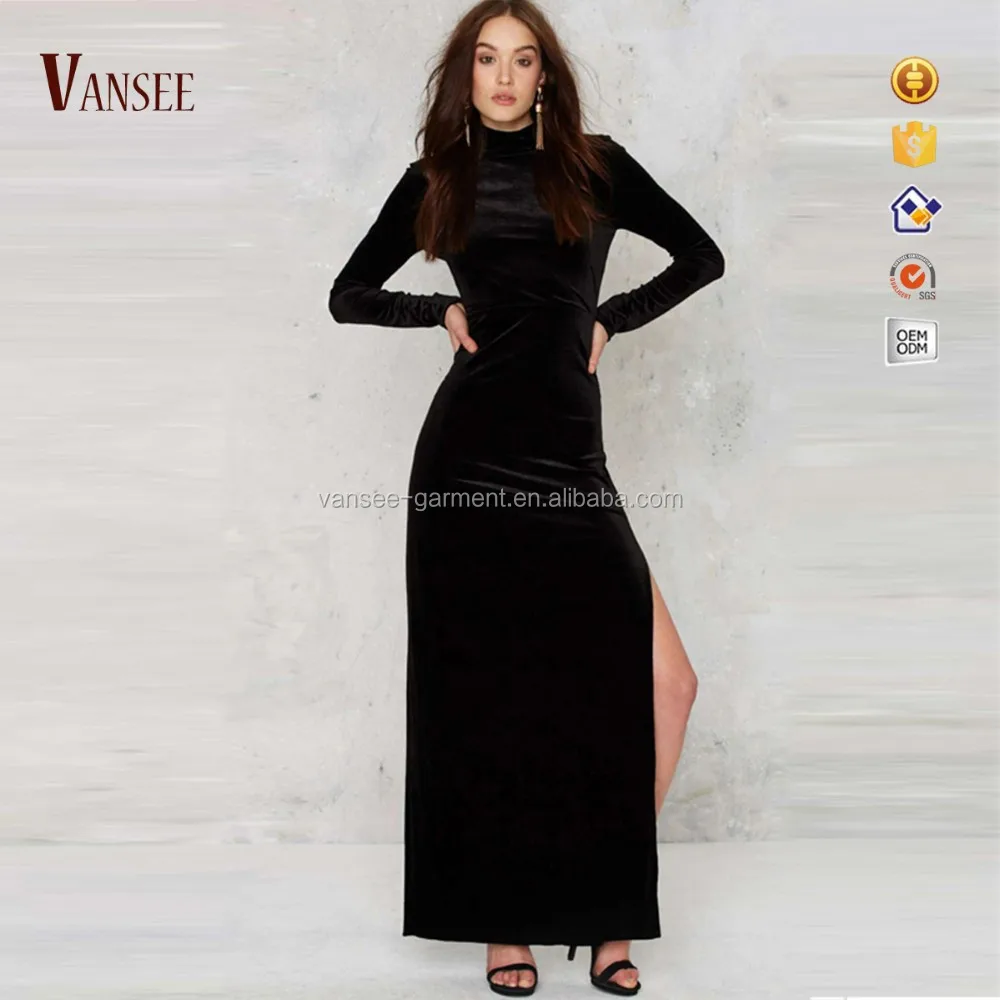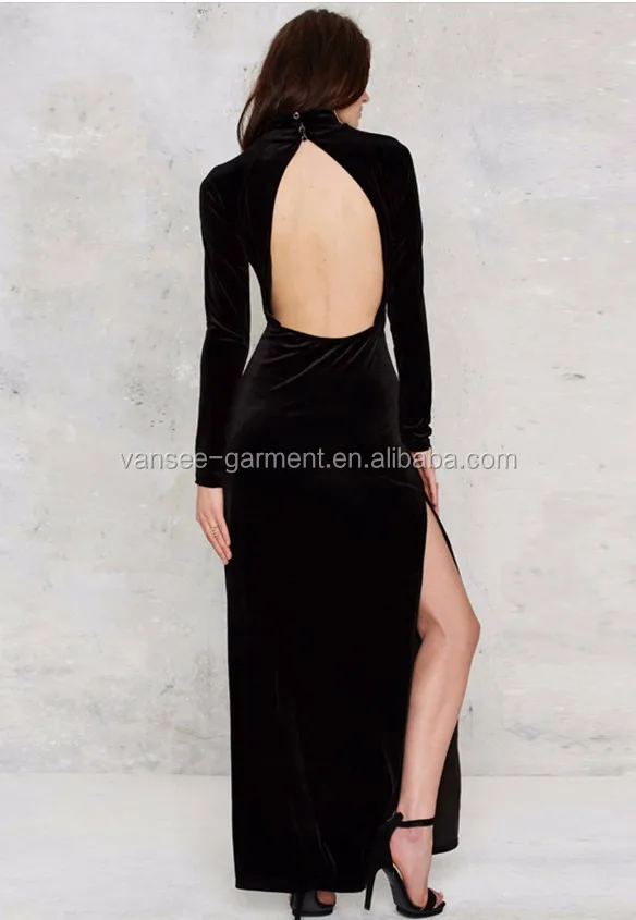 Plain black soft sexy long sleeve backless evening dress
