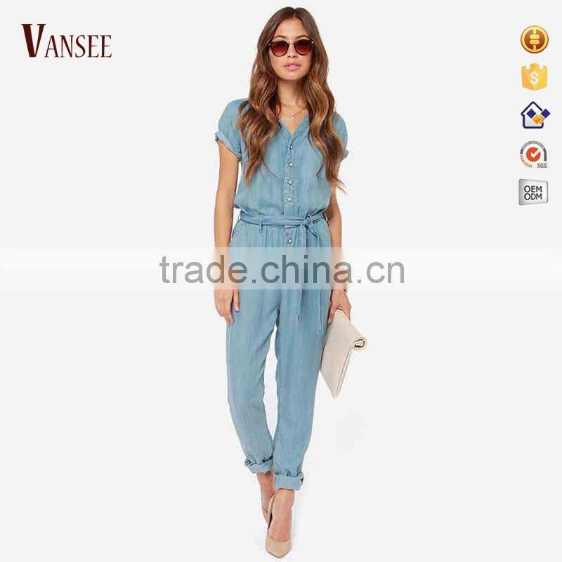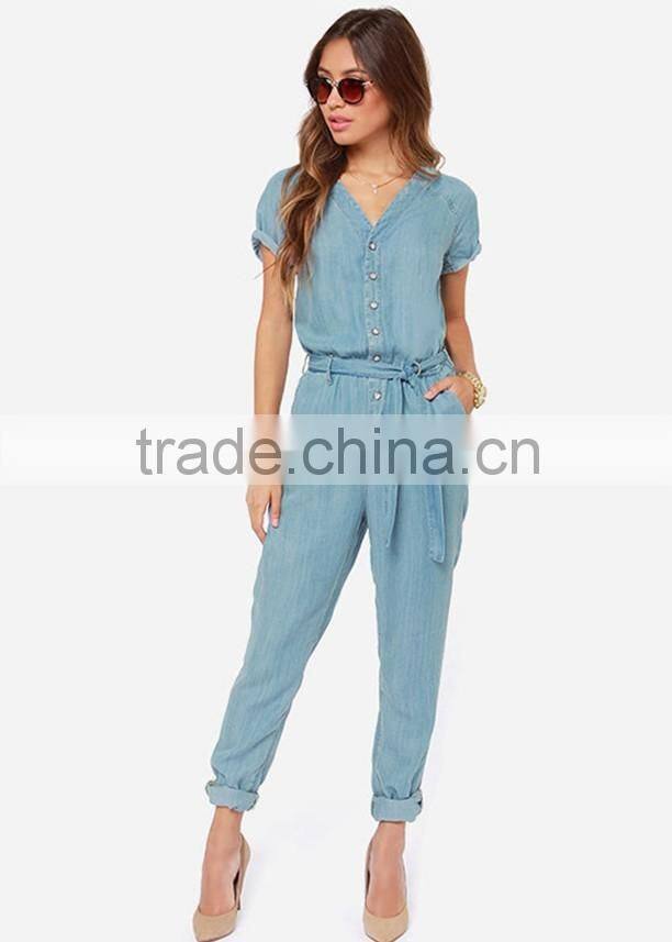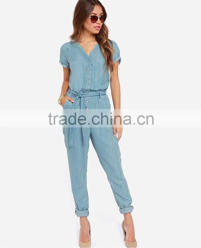 Women Sky Blue Belted Short Sleeve Slim Fit Jumpsuit Romper