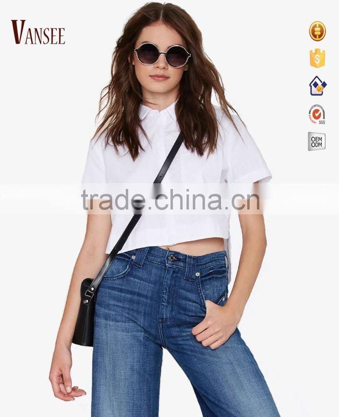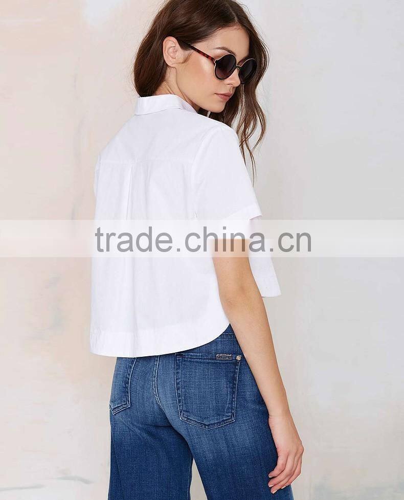 Lady's Slim Cotton Collared Solid White Shirt Short Sleeve Blouse