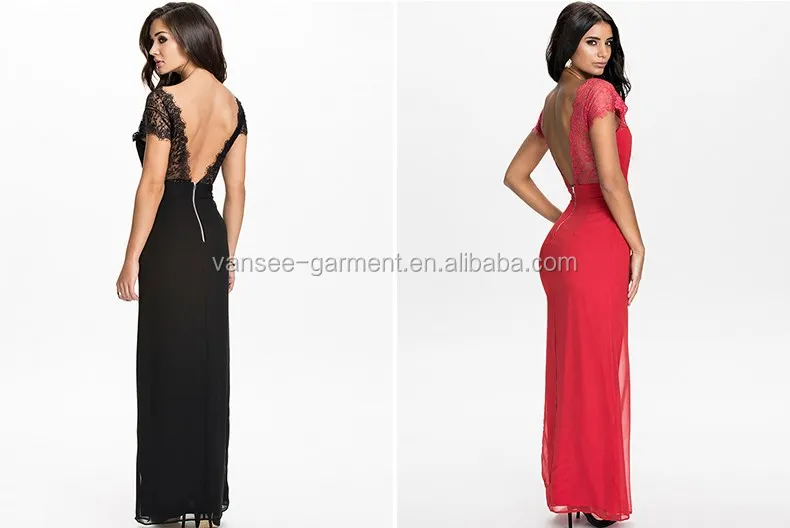 Plain dye slim fit elegant backless shortsleeve lace evening dress