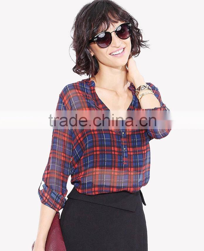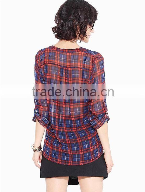 Women's Basic Classic Lightweight Collar Plaid Chiffon Shirt