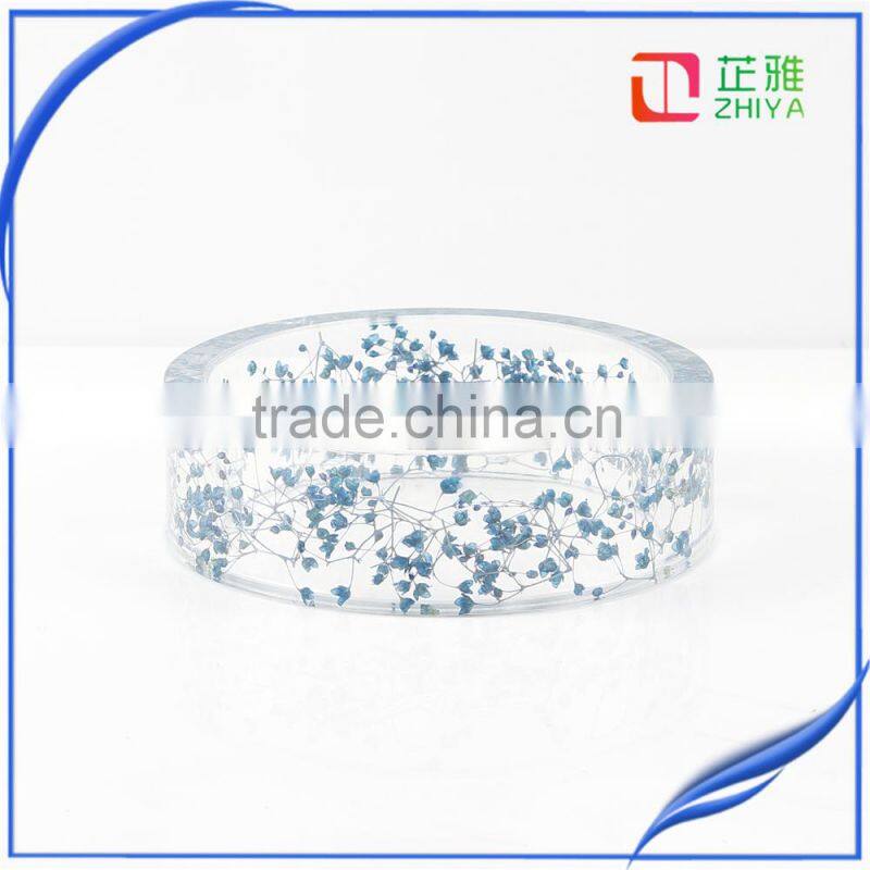 Handmade Wide Pressed Real Baby's Breath Blue Dried Flower Resin Bangle for Women