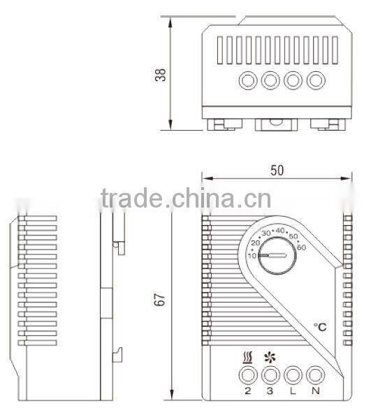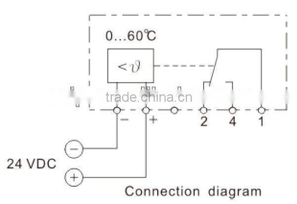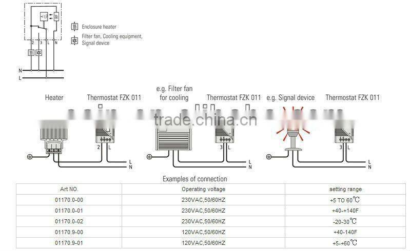 Switch temperature difference 4K (± 1.5K tolerance)* Sensor element thermostatic bimetal Contact type change-over snap-action contact Contact resistance < 10mOhm Service life > 100 000 cycles Max. switching capacity, NC 250VAC, 10 (4) A DC 30W Max. switching capacity, NO 250VAC, 5 (2) A DC 30W EMC acc. to EN 55014-1-2, EN 61000-3-2, EN 61000-3-3 Connection 4-pole terminal, clamping torque 0.5Nm max.: rigid wire 2.5mm², stranded wire (with wire end ferrule) 1.5mm² Mounting clip for 35mm DIN rail, EN50022 Casing plastic according to UL94 V-0, light grey Dimensions 67 x 50 x 38mm Weight approx. 0.10kg Fitting position variable Operating/Storage temperature -20 to +80°C (-4 to +176°F) / -45 to +80°C (-49 to +176°F) Protection type IP20