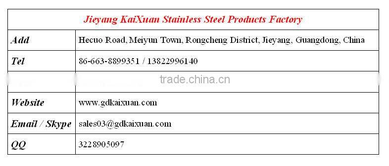 Jieyang KaiXuan Stainless Steel Products Factory locate in Meiyun Town, Jieyang City, Guangdong Province. Jieyang City is called Hardware City, is famous on the Stainless Steel Product. Jieyang City is in the east of Guangdong, 400 km from Shenzhen and 450 km from Guangzhou. It take 45 minutes by air and around 4 or 5 hours by bus from Shenzhen and Guangzhou.