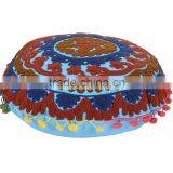 Suzani Mandala Floor Ottoman Poufs Indian Decorative Floor Pillows Embroidered Cushion Cover 16" Throw Shams With Pom Pom Lace