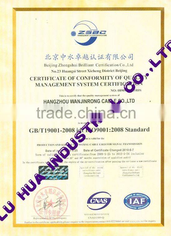 We have the most advanced testing equipment, and we have got some authority certificate of this field, such as the ISO-9001, CE, RoSHS, all of these contribute to insure that we can provide the products with high quality. Besides, we have improved our management system by attracting some staff with rich experience. You may rest assured that we can offer you the products both with high quality and productivity, and we have enjoy many approval and affirmation from home and abroad Our main products contains Coaxial cable, TV cable, Telecommunication cable, RF cable and Video cable, which has been widely used in the supervision system. According to their characteristics, they also can be divided into 2 types:1)RG59,RG6,RG7,RG11, 75 Ohm Coaxial Cable with Solid Polyethylene Insulation ,which is also named Vedio. cable;2)RG59,RG6,RG7,RG11, 75 Ohms Coaxial Cable with Gas-injected Foam Polyethylene Insulation, which is also named RF cable. Currently, the high-foaming coaxial cable is still the kind of cable both with high performance in transmission system and reasonable price, which is also can be demonstrated by the testing statistics in the band of Vedio, RF and Microwave.
