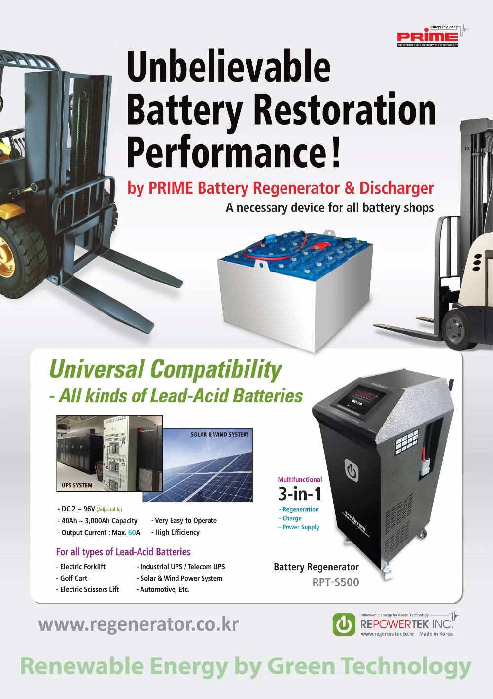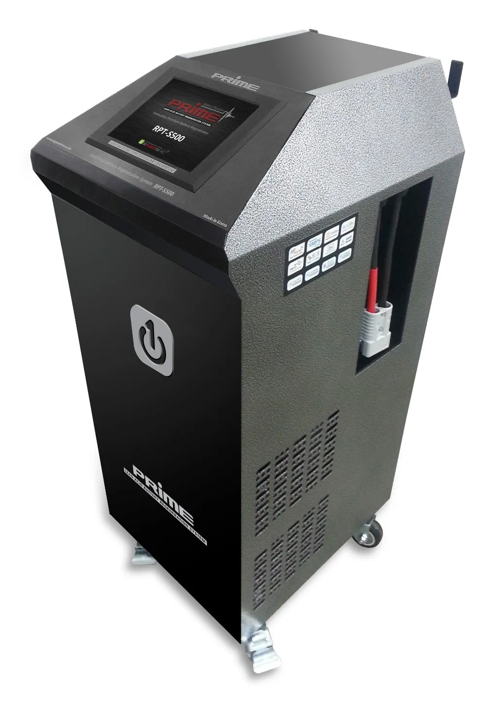 1. PRIME RPT-S500 Universal Battery Regenerator (All new renovation from 2016) : 2V~96V all-in-one voltage, 3.6KW SMPS, Max. 60A output current, 8 inch Touch Screen Monitor. This system easily de-sulfates all kinds of lead-acid batteries up to 3,000Ah such as Forklift, Telecom UPS, Golf Carts and automotive /solar/UPS batteries with sizes of 2-volt, 4-volt, 6-volt, 8-volt, 10-volt, 12-volt, 24-volt, 36-volt, 48-volt, 60-volt, 72-volt, 80-volt, 84-volt or 96-volt batteries. You can also connect batteries in series, such as max. 8 batteries of 12 volts each, which equals a 96-volt bank of batteries or max. 24 batteries of 2 volts, which equals a 48-volt bank of UPS and Forklift batteries as well. And more .... (Maximum Power Consumption : 3.6KW, Maximum Input AC Current : 20A, 210~240VAC, Single Phase - Direct cable connection to the main breaker)