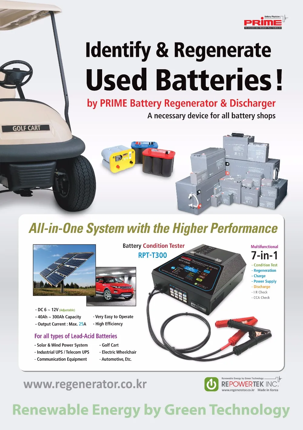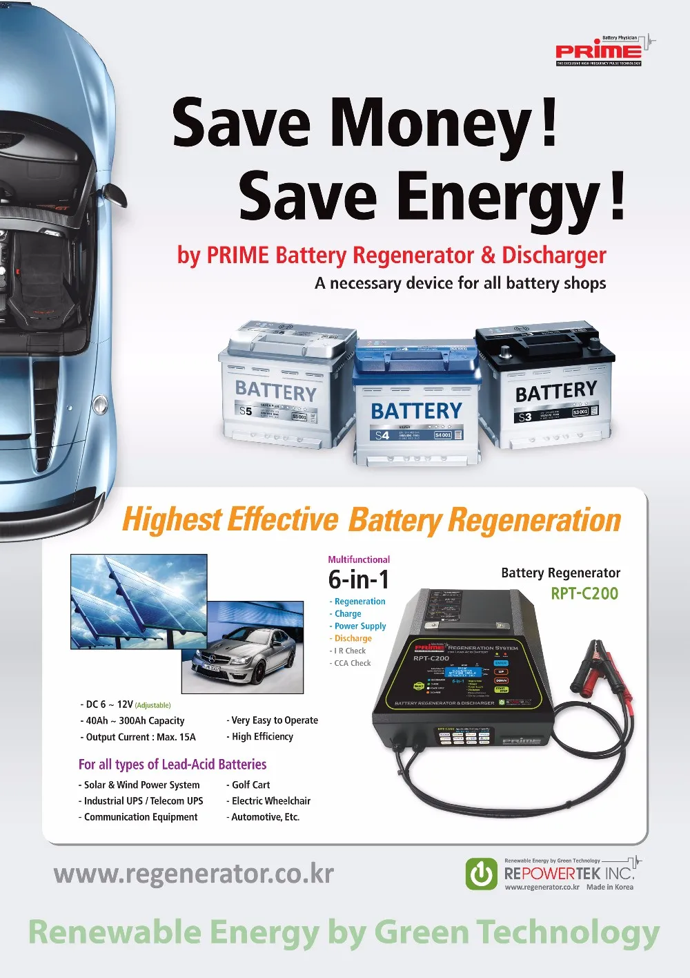 * PRIME Regenerator : With the world exclusive high-frequency pulse and restoration algorithm, it can restore inside cells by melting sulfate crystals on the plates and grids, and it can improve its capacity and life span as almost similar as new battery condition. PRIME Battery regenerators were developed by the World Exclusive Technology, and these make the remarkable micro-bubble featured de-sulfation effects by the real high-frequency pulsations. And these can make the highest charging performance for used-batteries. PRIME technology is the revolutionary invention for battery life extension and cost savings!