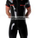 100%nature Latex Black and Red Stripe Latex Catsuit Zentai Front Zipper Under Crotch Short Sleeves Short Pants for Men Plus Size