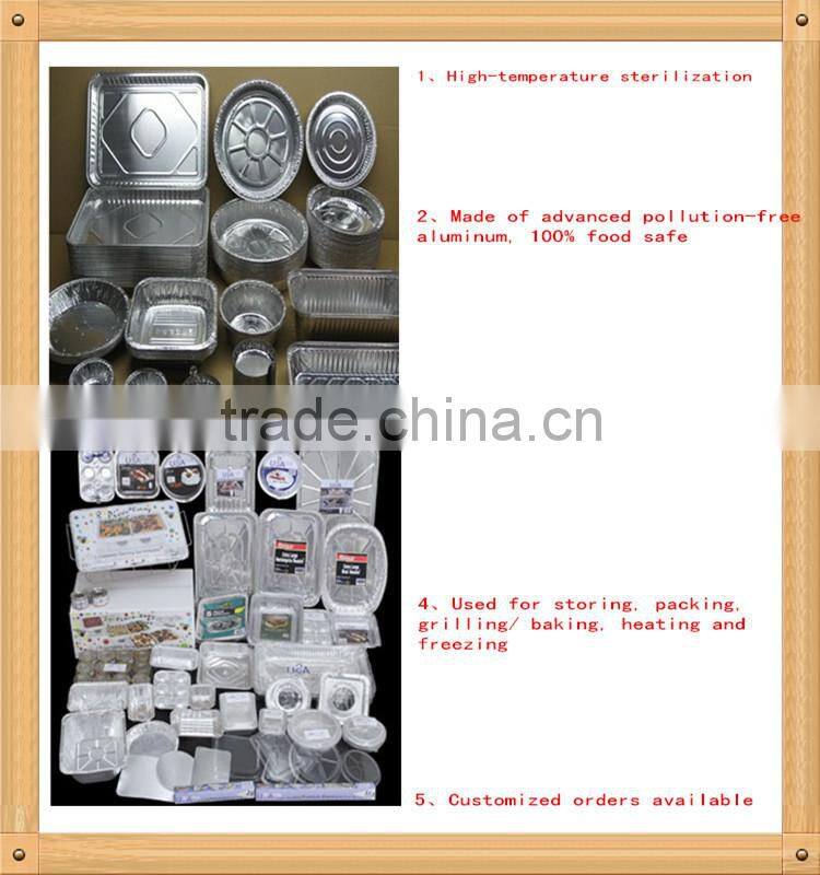 detail features | 1. Materials: Aluminum Foil, good glossy environment-friendly and recyclability 2.Various dimensions and shapes available, including rectangle, oblong and square with hemmed and curl edge 3.Packing: Hot Shrink Packing ,Bulk Packing ,Display Box Packing 4. High temperature sterilization 5. Make the molds as customers’ requirements |