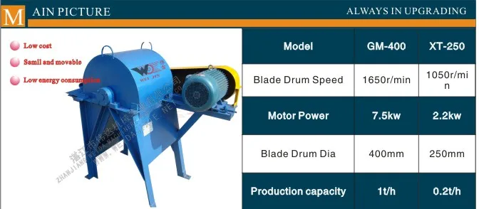 This machine mainly consists of the rack,blade drum, fixed blades, feeding mouth/inlet, safely cover, diesel engine(or motor).