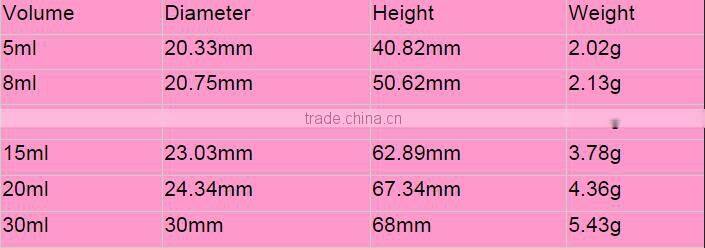Volume | 3ml, 4ml, 5ml,8ml, 10ml, 15ml, 18ml, 20ml, 30ml,50ml. | 5ml, 10ml,20ml, 30ml. | 2ml, 3ml, 5ml, 8ml, 10ml,15ml, 18ml, 20ml, 30ml, 50ml, 60 ml,100ml, 120ml, 150ml. |