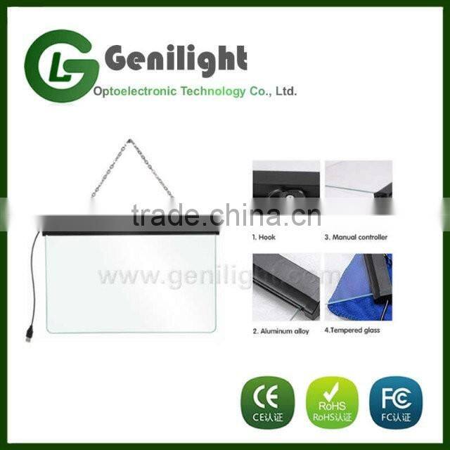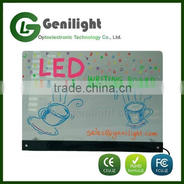 Led writing board is a new powerful & eye-catching marketing tool. Content can be handwritten on the glass or acrylic surface with fluorescent marker pens.Content can be removed by wiping the surface with a cloth eraser.