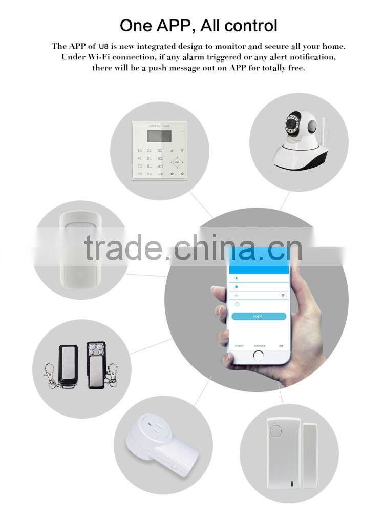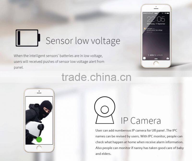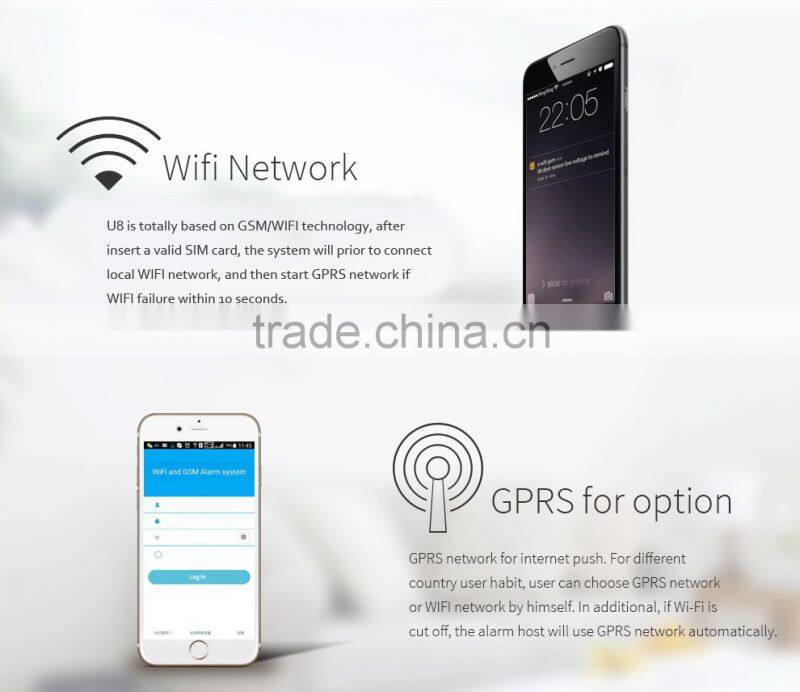 U8 is totally based on GPRS/GSM/WIFI technology, after insert a valid SIM card, the system will prior to connect local WIFI network, and then start GPRS network if WIFI failure within 10 seconds.The entire system is ran by your phone (including normal GSM cellphone and smart phone with app). The app features with away arming/stay arming/Disarming, and phone number setting, Zone attribution...etc. Simply place your motion sensor interior your home, and door/window sensors for main entry points, and activate the system, when any one of sensor is triggered, it will set off alarm. The alarm system will not only push the alarm message to the application of smartphone, but also make voice phone call and SMS as per your needs. 100% make sure user will be notified in time.