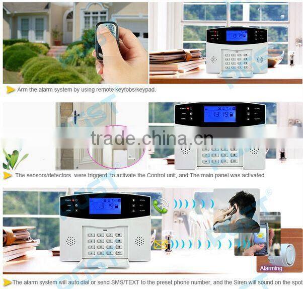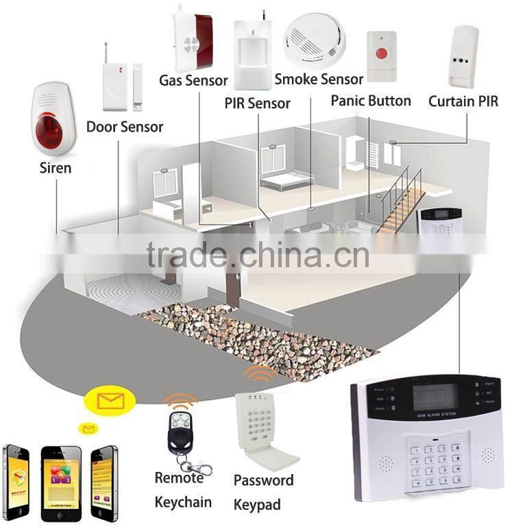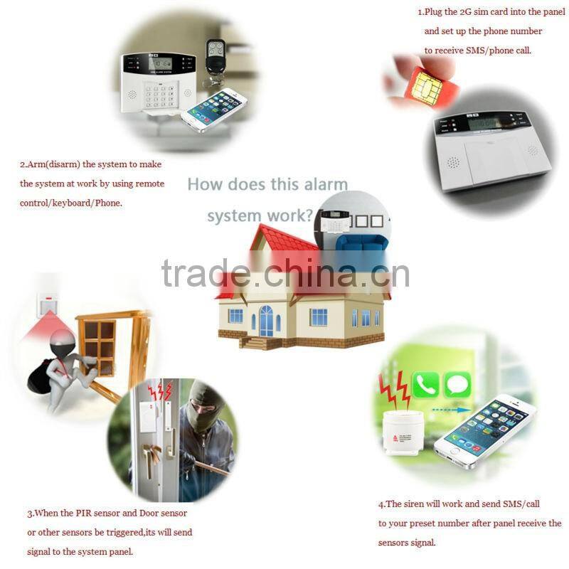 This Alarm is totally based on GSM cellular technology, after insert a valid SIM card, the system will connect into GSM wireless cellular network. The entire system is ran by your phone,with away arming/stay arming/Disarming, and phone number setting, Simply place your motion sensor interior your home, and door/window sensors for main entry points, and activate the system, when any one of sensor is triggered, it will set off alarm. The alarm system will not only make voice phone call, but also sending text message for alarm notification.
