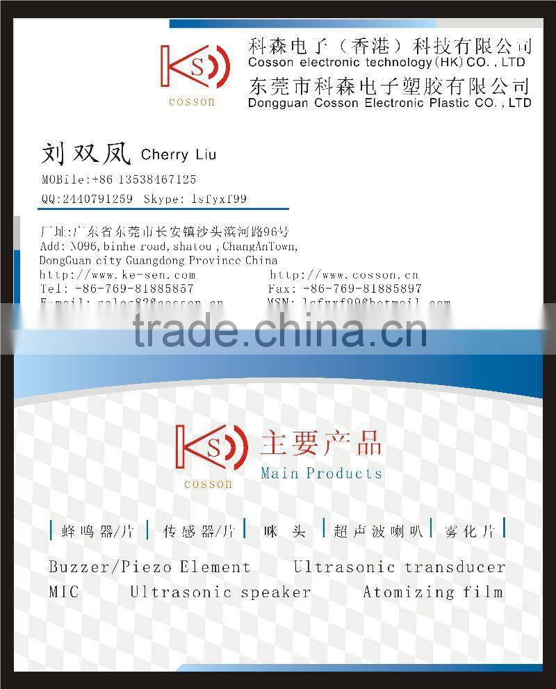 We specialize in producing Electro-acoustic components such as Buzzer (Piezoelectric buzzer /Electromagnetic buzzer / Mechanical buzzer / SMD buzzer ), Piezoelectric ceramic element ,Condenser microphone , Ultrasonic sensor , Atomiztion piece etc.