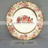 Charger plate are larger decorative plates used to dress up dinner tables at parties , weddings, many kinds of holiday and other special events. Charger plate is left on the table as a large coaster for the soup and salad courses and then removed for the main entree. Others keep the underplate. Charger or chop plates together until the end of the entire meal.The main function of charge plate can protect desk from heat,spills and scratches.
