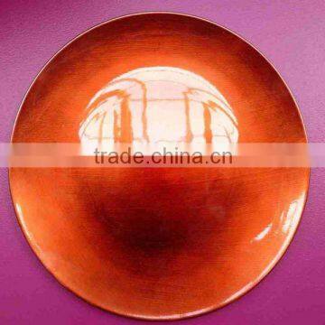 Charger plate are larger decorative plates used to dress up dinner tables at parties , weddings, many kinds of holiday and other special events. Charger plate is left on the table as a large coaster for the soup and salad courses and then removed for the main entree. Others keep the underplate. Charger or chop plates together until the end of the entire meal.The main function of charge plate can protect desk from heat,spills and scratches.