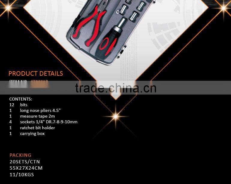 A: Our product line includes: Screwdriver, Hammer, Hex key, Bit, Bit holder, Socket, Pliers, Utility knife, Ratchet holder, Adjustable wrench, Booster cable, Tire pressure gauge, Test pen, Measure tape, Spirit level etc.and they are assembled to Household tool set, Emergency car repair tool set, Lady pink tool set, Tinplated box tool set, Tool bag set, Bit set, Socket set, Screwdriver set etc.