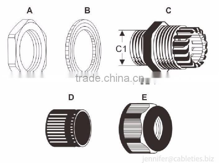 Material:UL approved nylon PA66(Flammability UL94V-2)for A,C,E parts(accept to customize flammability UL 94V-0 ).EPDM rubber for B,D parts(accept to customize resist high temperature rubber,resist strong acid/alkali,etc)