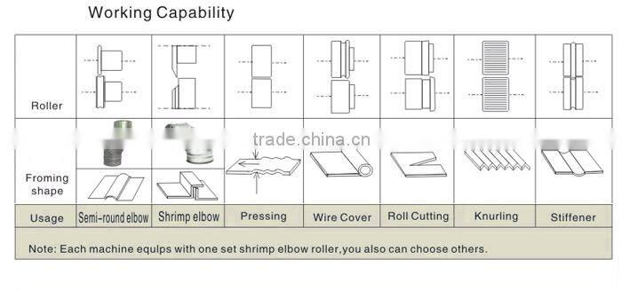The metal sheet is rolling and forming with special rolling wheels, the main forming shapes consists of cam, line, tenon, slot, cutting, embossing, elbow joints etc. It is suitable for such industries as environment product, ductwork making, kitchen ware,lamp ornaments, metals, white iron, metal vessels and decoration engineering. With manual and electric operation and compact structure and multiple functions, the product can also be made according to client's requirements.