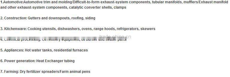 A:stainless steel and 430 stainless steel are widely used for: kitchenware, tableware, cutleries, stainless steel pots, plates & bowls, sinks, gas stove, disinfection cabinet, household appliances, construction decorations etc. 409L stainless steel is usually used for exhaust pipe.