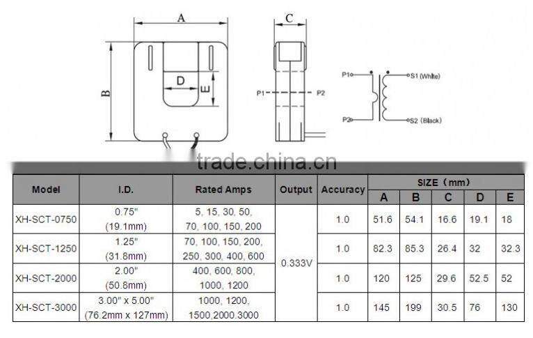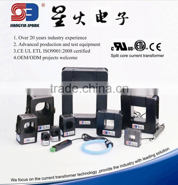 The JIANGYIN SPARK series of split core transducer are designed for fast and easy installation.The split core design permits non-contact current measurements through magnetic field induction without requiring that the primary wire be taken offline and disconnected for CT installation.This method permits a safer,easy and portable current measurement. An internal precision burden resistor across the secondary winding of the CT provides a safe low voltage output and permits safe opening of the secondary