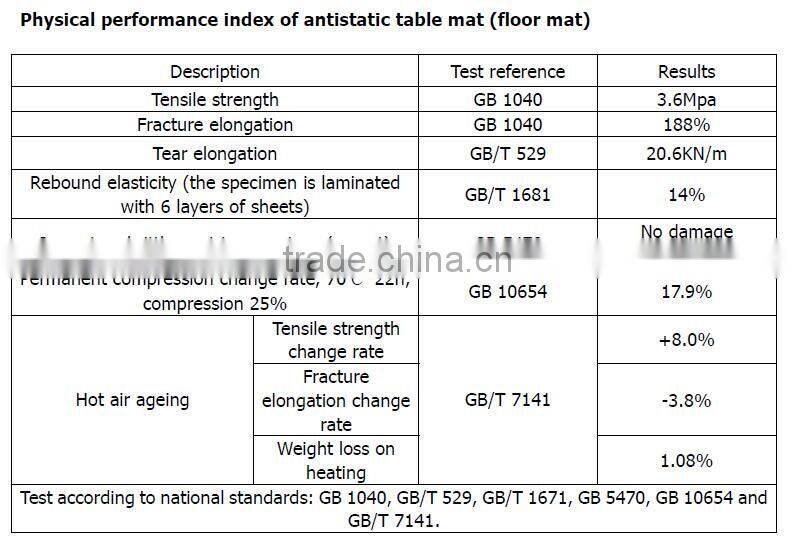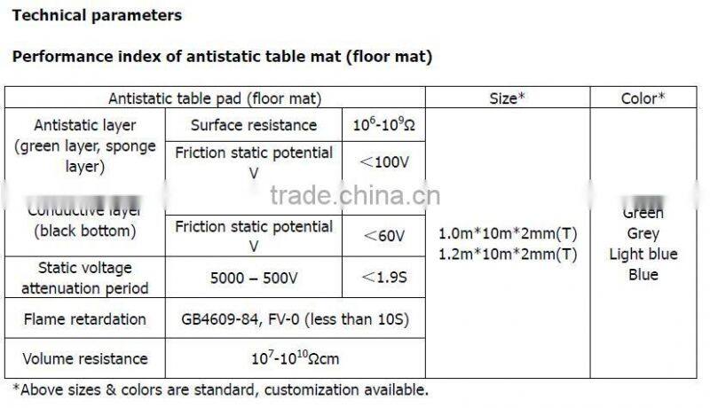 Our antistatic table mat/floor mat does not contain sulphur, which easily reacts with other substances to cause decoloring of the products and bring harm to human body.