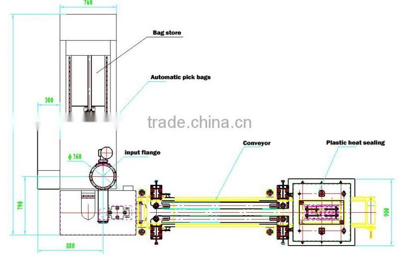 M-type automatic bagging machine: a combination of vacuum bags and warehouse equipment, automatic bag system, feeding mechanism and the main electrical box, mold, vibration transmission and body bags, automatic heat sealing machine and control box, feeding auger and silo