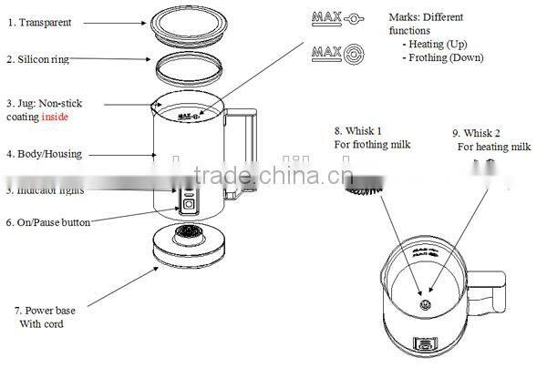 1. Heats milk to around 65 (+/-) degrees 2. 2 layers non-stick coating 3. Reliable famous brand connector Kestol/Otter 4. Slanted Induction whisking for frothing and bucket-shaped concave surface 5. Automatic switch off, a spare stirrer storage groove 6. Over-load caution function |