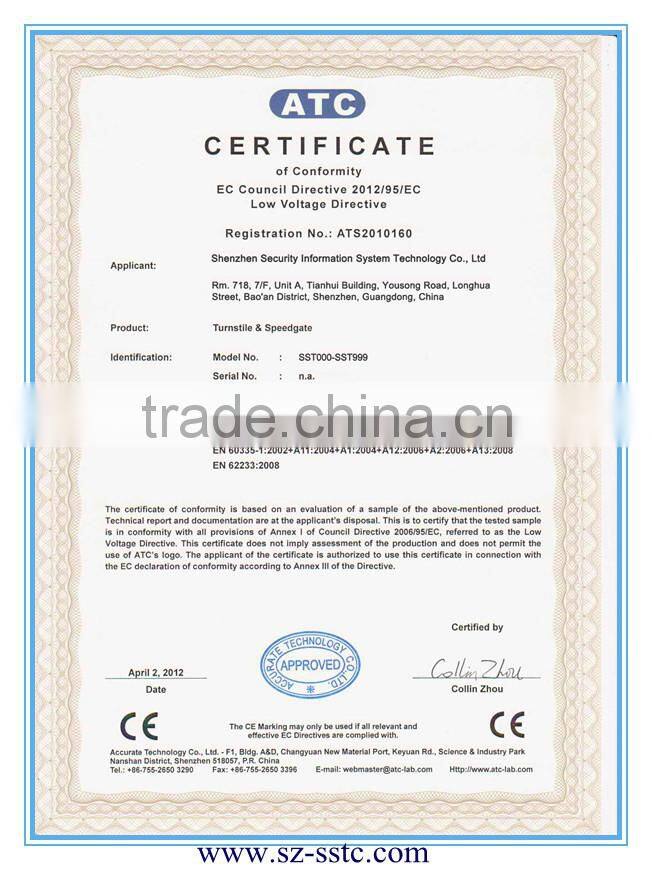 Integrating mechanism, electronics and micro-processor advanced technologies.The swing turnstile is a improvement of intelligent tripod turnstiles.Equip various card-reading machines with hi-performance security protection SW to realize real-time warning and clever LED counter display guide passers .it balance pedestrian intelligent control and management.
