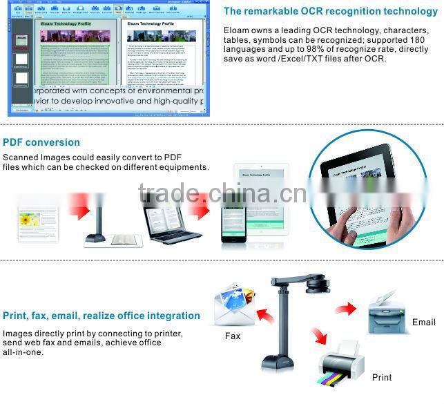Eloam document scanner possess the advanced OCR technology by which more than 180 languages, tables; bars, C++. Java and other special symbols can be recognized through automatically analyzing the sections. The recognition rate reaches up to 98%, supporting the mixed recognition of multi-language, character, and numbers with the same layouts results as original images. OCR documents can export directly to Word, Excel or Txt format..