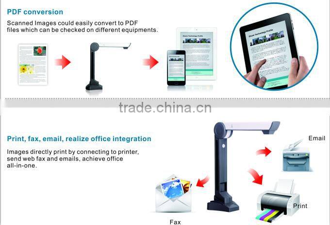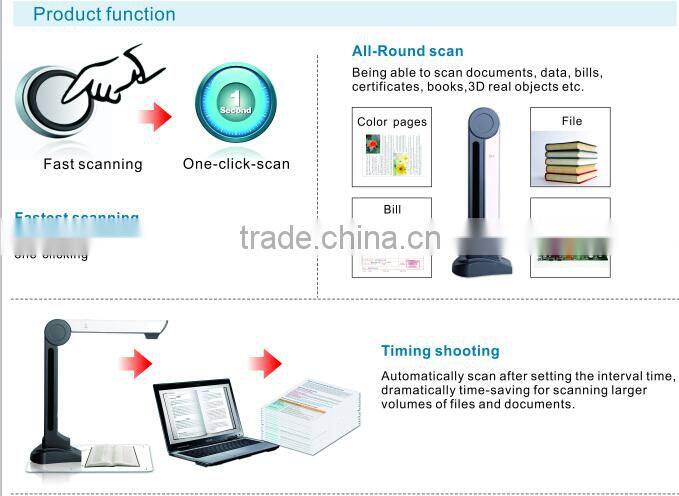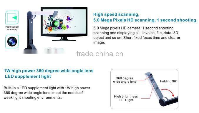 5.0 Mega pixels HD camera, 1 second shooting, scanning and displaying bill, invoice, file, data, 3D object and so on. Short fixed focus time and clearer image.