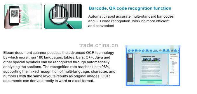 Eloam document scanner possess the advanced OCR technology by which more than 180 languages, tables; bars, C++. Java and other special symbols can be recognized through automatically analyzing the sections. The recognition rate reaches up to 98%, supporting the mixed recognition of multi-language, character, and numbers with the same layouts results as original images. OCR documents can derive directly to word or excel format..