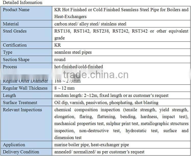 The KR steel pipes are produced by Chinese excellent mills which have strict quality management systems. We not only offer the seamless steel pipe for boilers and heat-exchangers, but provide pressure steel pipes, stainless steel pipes, alloy steel pipes, welded steel pipes... All of them are able to be certified by Korean register of shipping. If you are interested in our steel pipes and tubes, welcome to contact us!