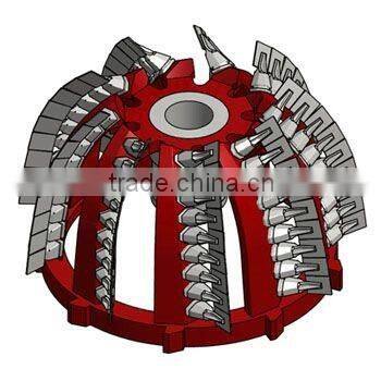 The basic cutter head skeleton includes a hub, a ring and several curved arms that link the hub and ring together. The adapters with teeth or replaceable cutting edges are fitted on the front side of the cutter arm.