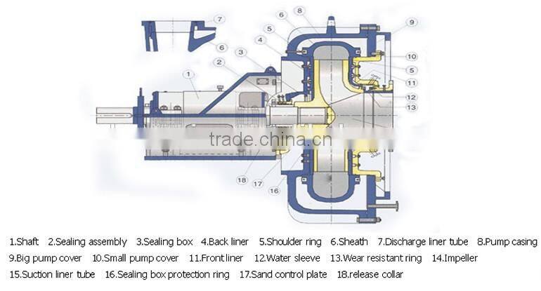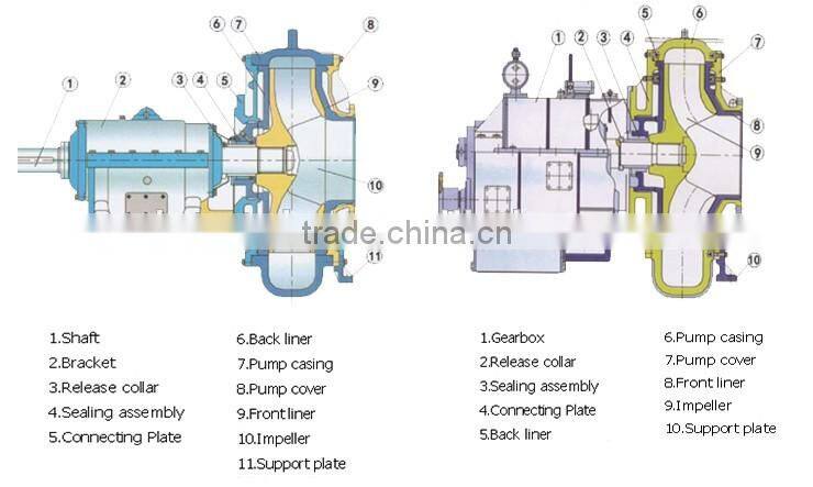 200 WN - 500 WN type dredge pump integral by a single pump shell, single stage single suction cantilever horizontal structure, press and gear box of the connection way all can provide two kinds of typical structure, namely take bracket type and pump box and type. Own bracket type lubrication way as the grease lubrication or thin oil lubrication.