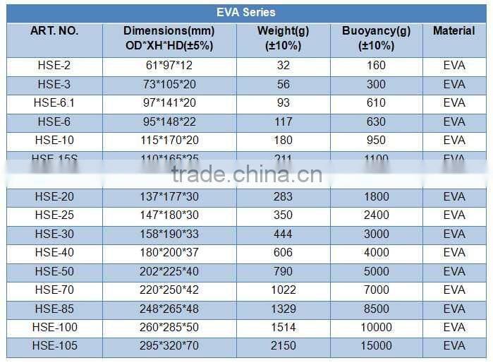 EVA buoy floats are used with the fishing nets for fishing and fish farming in shallow sea or lake. It has diferent shapes and all specifications for different use.