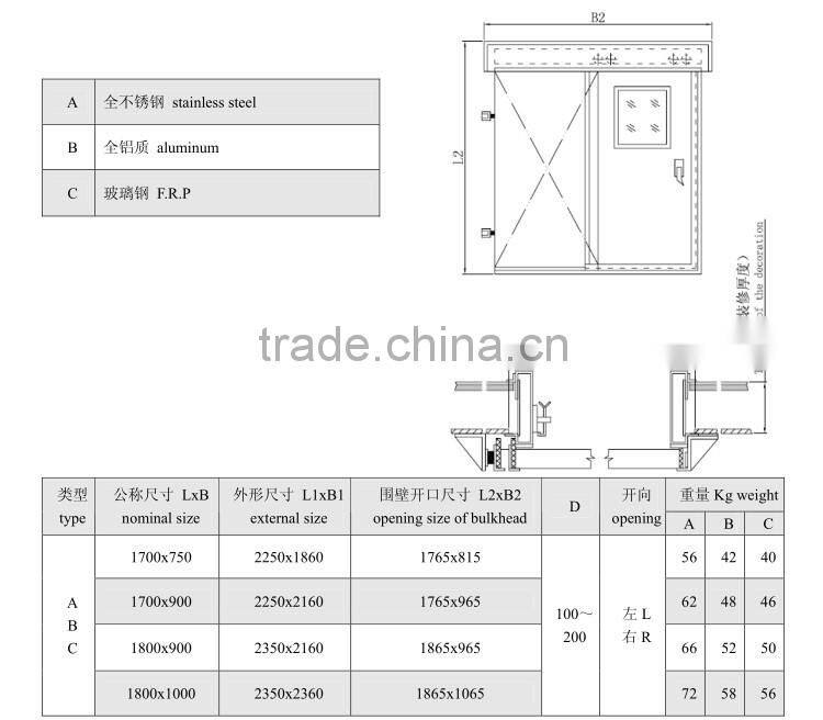 Aluminum / FRP / stainless steel slding door for wheelhouse is a kind of sliding door which is easy to be installed and opened. The product is to be made in accordance with standard of ISO and CBM2055-82. It features low noise, beauty, and light weight. It can be applied to various kinds of ships.