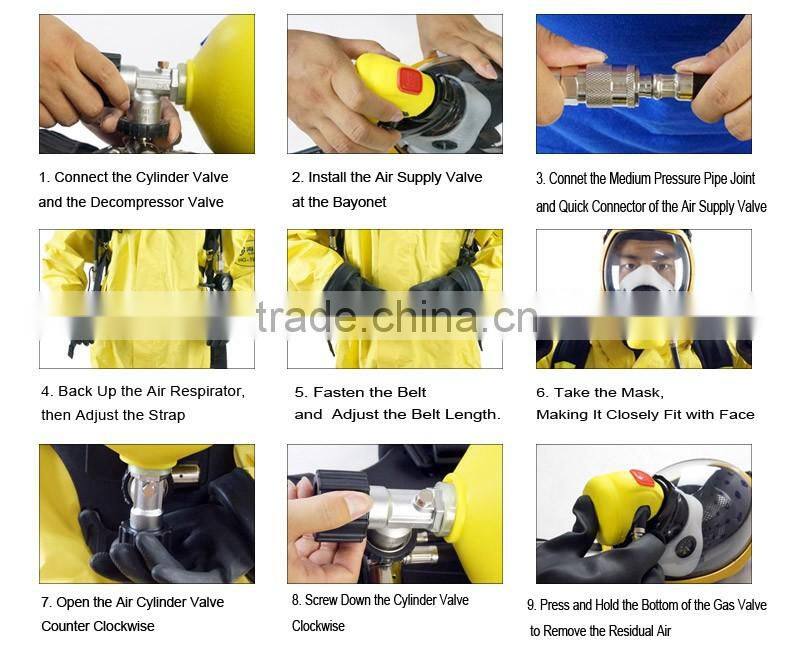 2. Close the bayonet belt, adjust the belt length to the appropriate position with the mask, adjust the tightness to face mask and caps, open the gas cylinder switch valve and turn over three times in a counter clockwise direction; take a deep breath and breathe into the working area