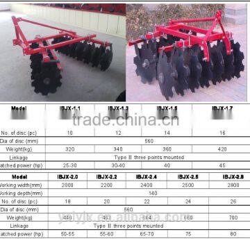 1BJX-1.7/2.0/2.2/2.4 suspension middle-duty disc harrow with 16 or 18 or 20 or 22 blades is suitable for pulverizing and loosening clods after plough and for planning the land before sowing. On cultivated land . It can make soil and fertilizer mix up and clear away the stump of plants . The harrow is simple in construction , durable in service , ready to operate, easy to maintain and efficient in pulverizing and penetrating into the soil and leaves the land with smooth , All these satify the agricultural requirements of intensive cultivation