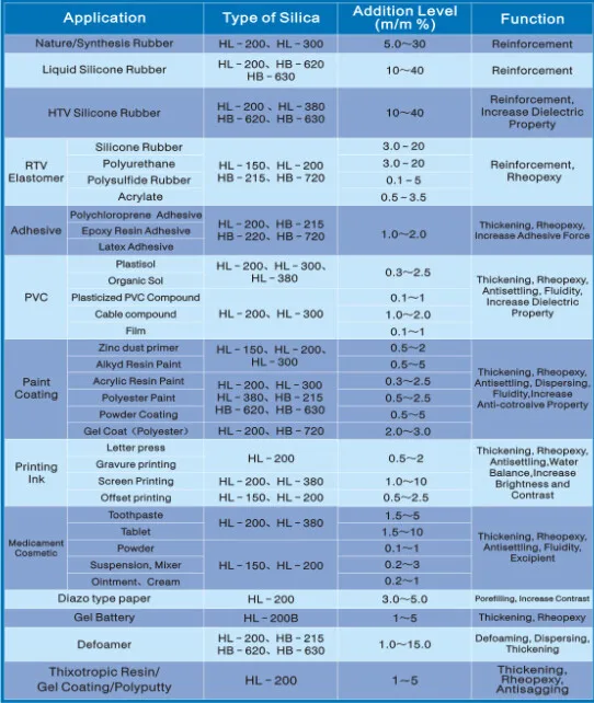 Effect:Fumed silica is used as thickening, thixotropic and reinforcement agents in RTV rubber and adhesive.