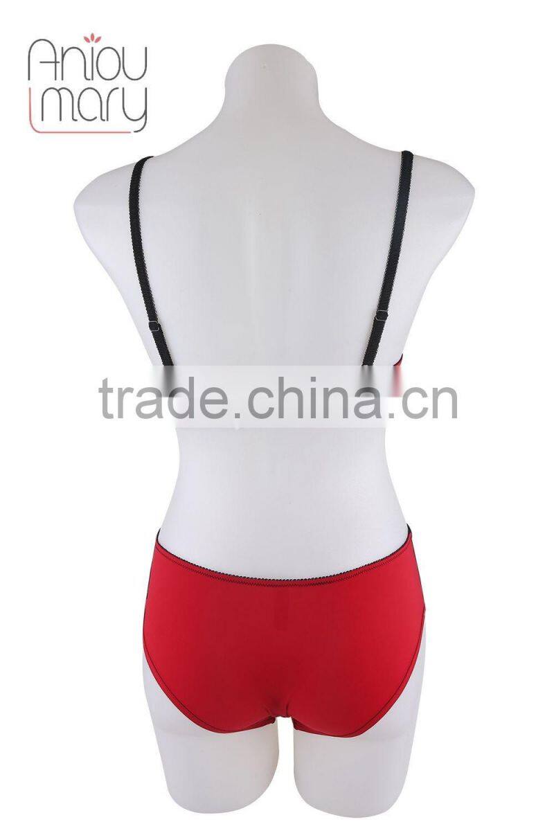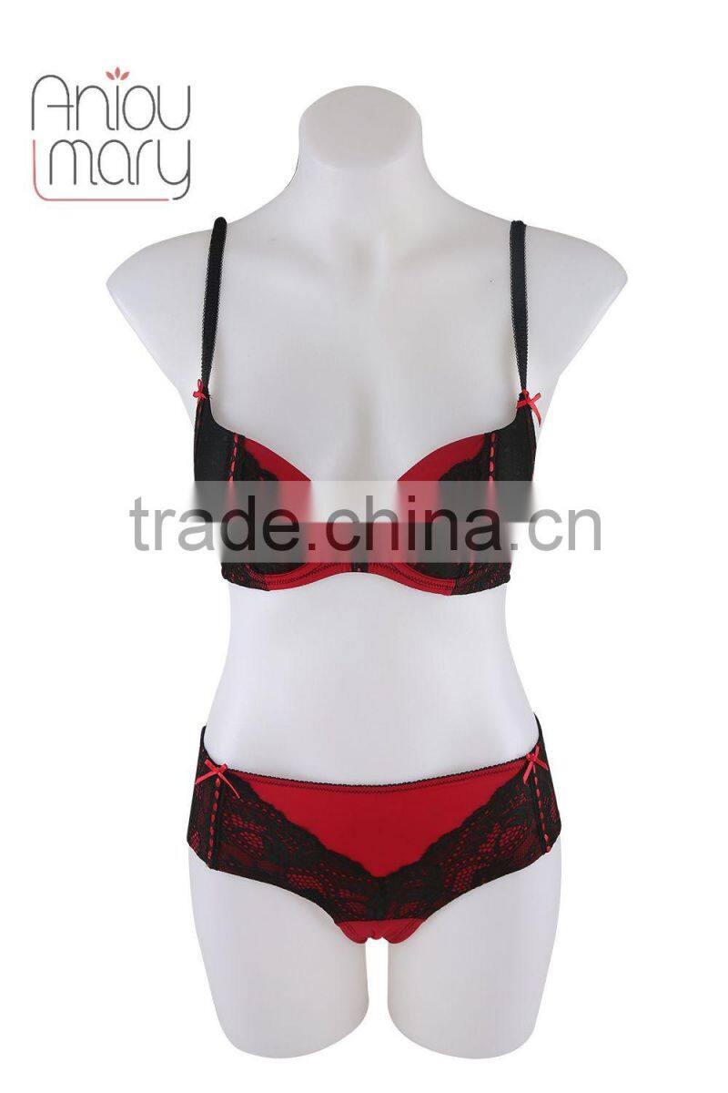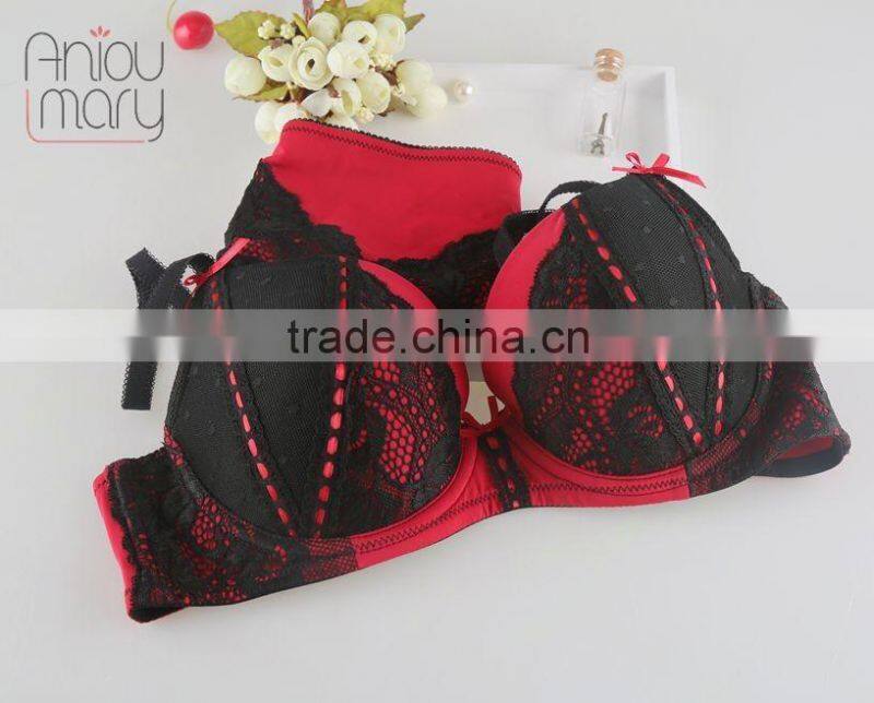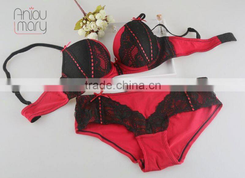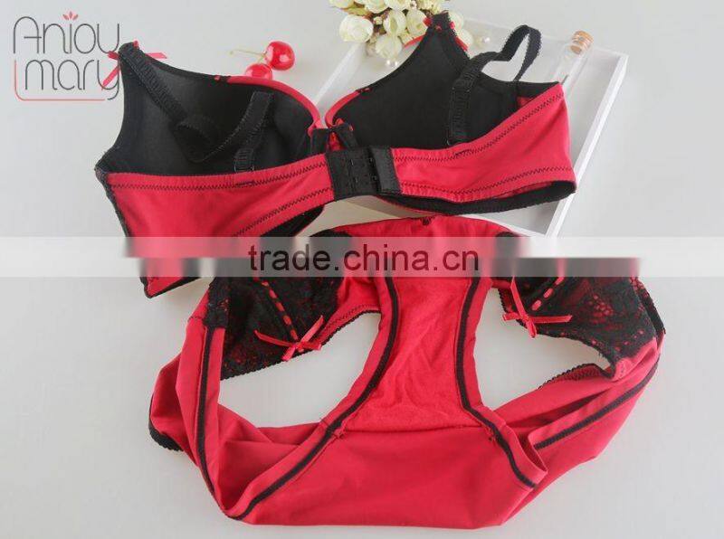 Mature women sexy Nylon red with black color lace fancy bra panty set, bra and panty