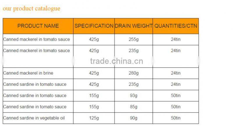 | 125g canned sardine in vegetable oil | 155g canned mackerel in tomato suace | 155g canned sardine in tomato sauce | 425g canned mackerel in brine |